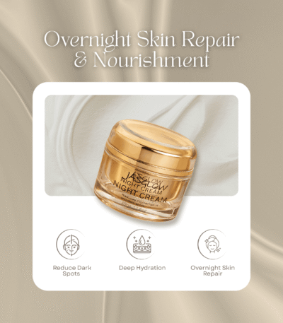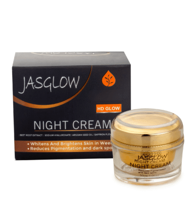 Jasglow Brightening Night Cream is a rich overnight formula infused with Beetroot Extract, Saffron, Sodium Hyaluronate, and Argan Seed Oil. It deeply nourishes the skin, helps reduce pigmentation and dark spots, and restores brightness by morning. Wake up to smoother, softer, and visibly radiant skin with regular use.