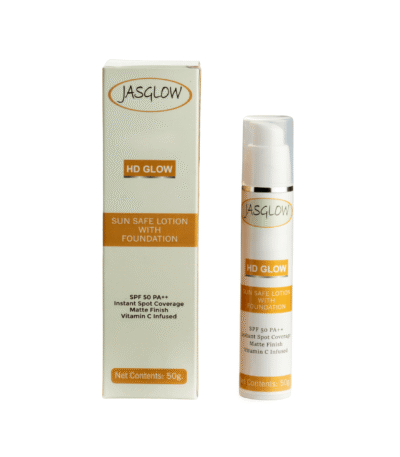 Jasglow Sunsafe Lotion with Foundation SPF 50+ offers high sun protection along with instant spot coverage for a naturally even complexion. Its matte finish controls oil while Vitamin C helps boost skin radiance. Perfect for daily wear, this lightweight formula blends easily and leaves skin protected, smooth, and fresh.