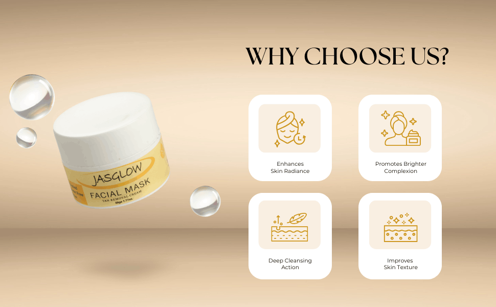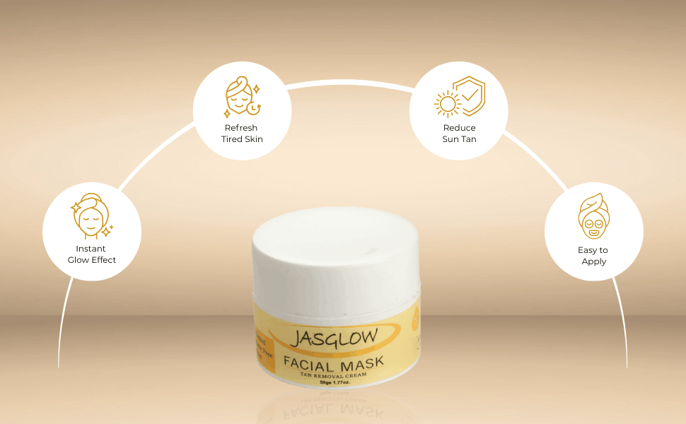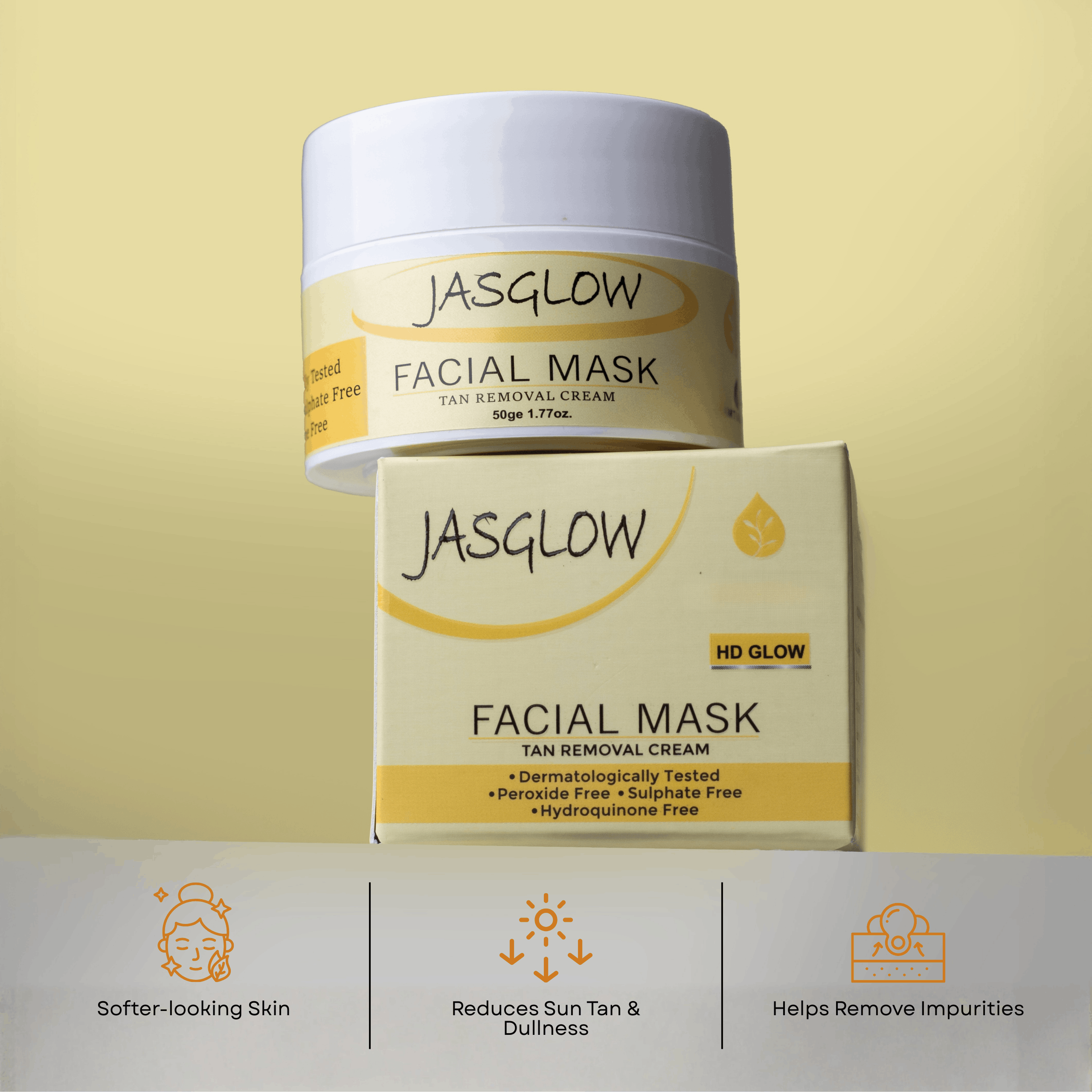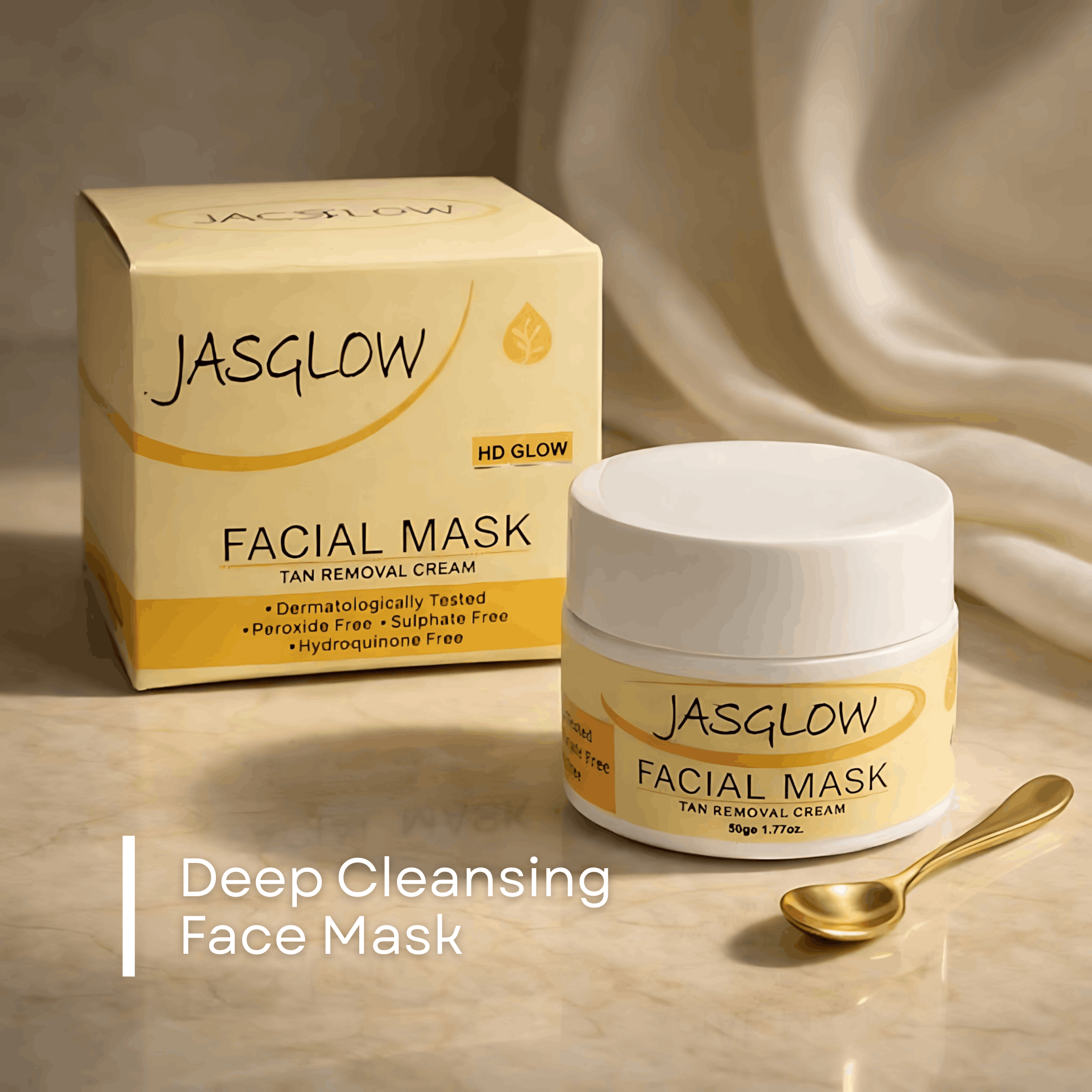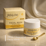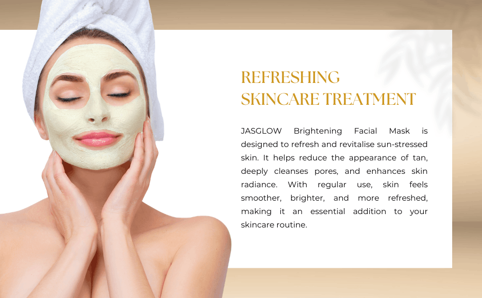 Jasglow Brightening Facial Mask is designed to refresh and revitalise sun-stressed skin. It helps reduce the appearance of tan, deeply cleanses pores, and enhances skin radiance. With regular use, skin feels smoother, brighter, and more refreshed, making it an essential addition to your skincare routine.